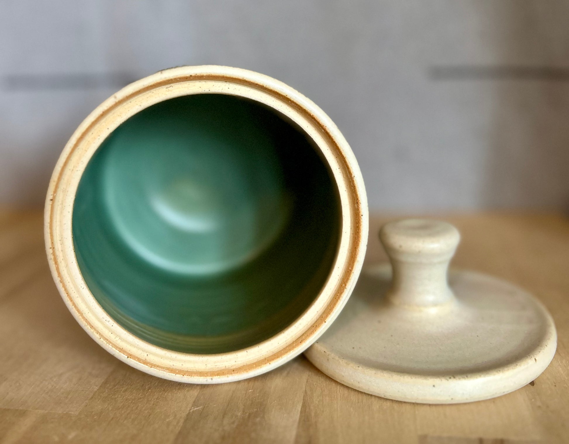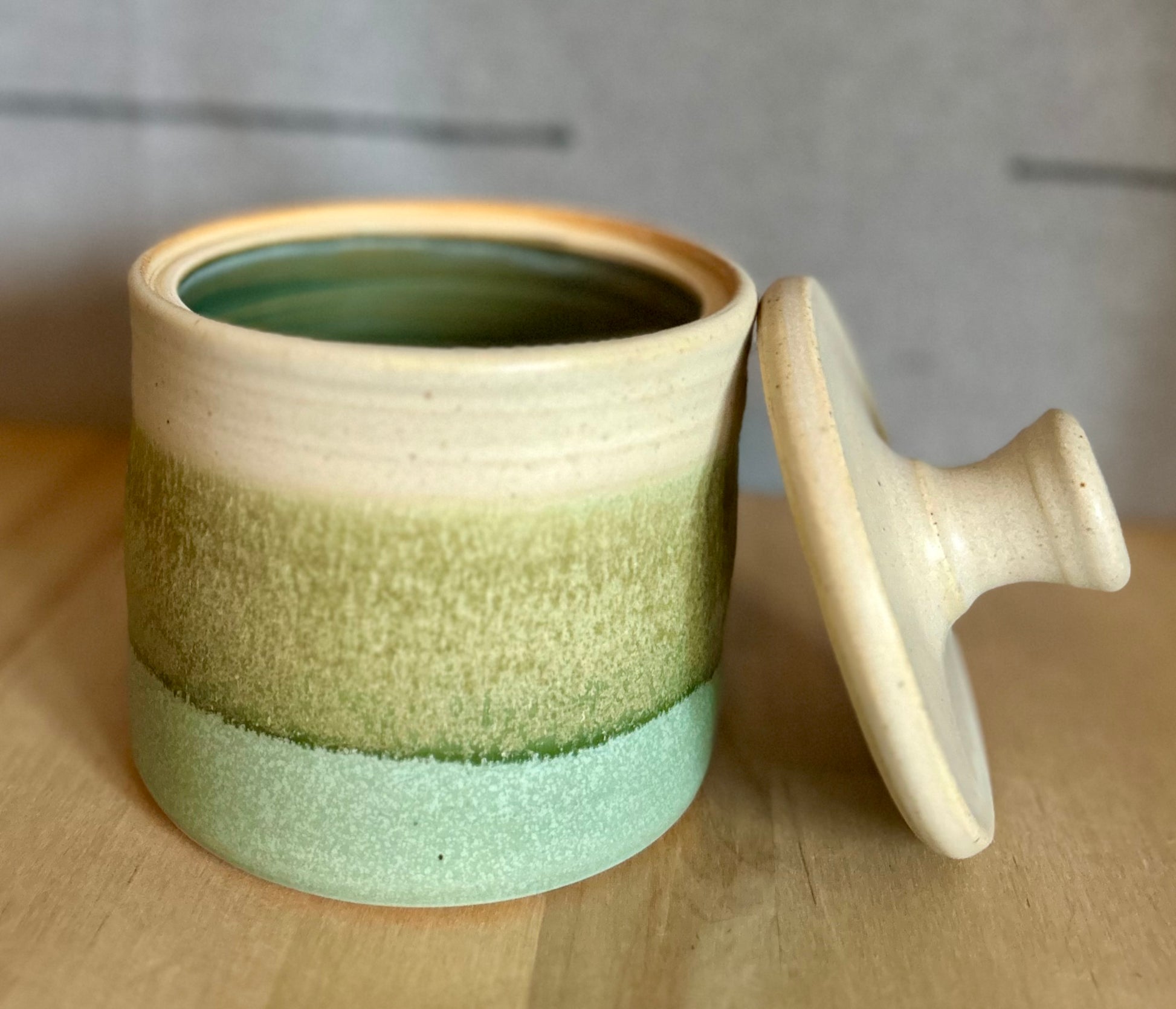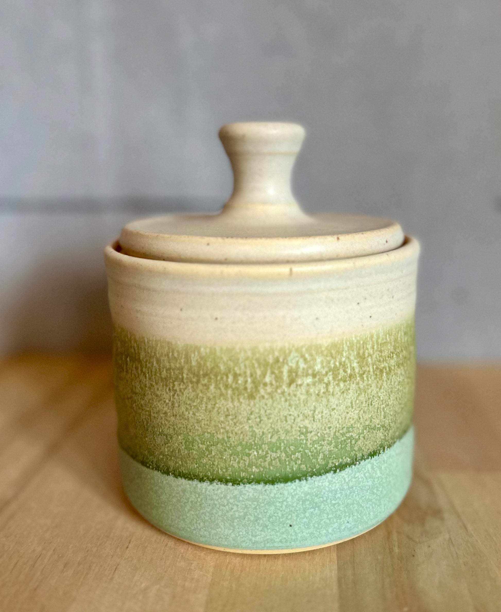4”(without lid) 6”(with lid) tall 4.5” wide. Hand thrown in small batches in Door County, WI, each Garden Girl Stoneware piece is a unique, one-of-a-kind vessel. Fired to over 2200 degrees, these pots are food-safe, durable, and made for everyday use--dishwasher ready and adventure approved. From road trips and job sites to campfires and backyard farms, this stoneware is meant to be used. Earthy glazes and forms are inspired by antique utilitarian stoneware and the enduring beauty of nature. Dishwasher safe.