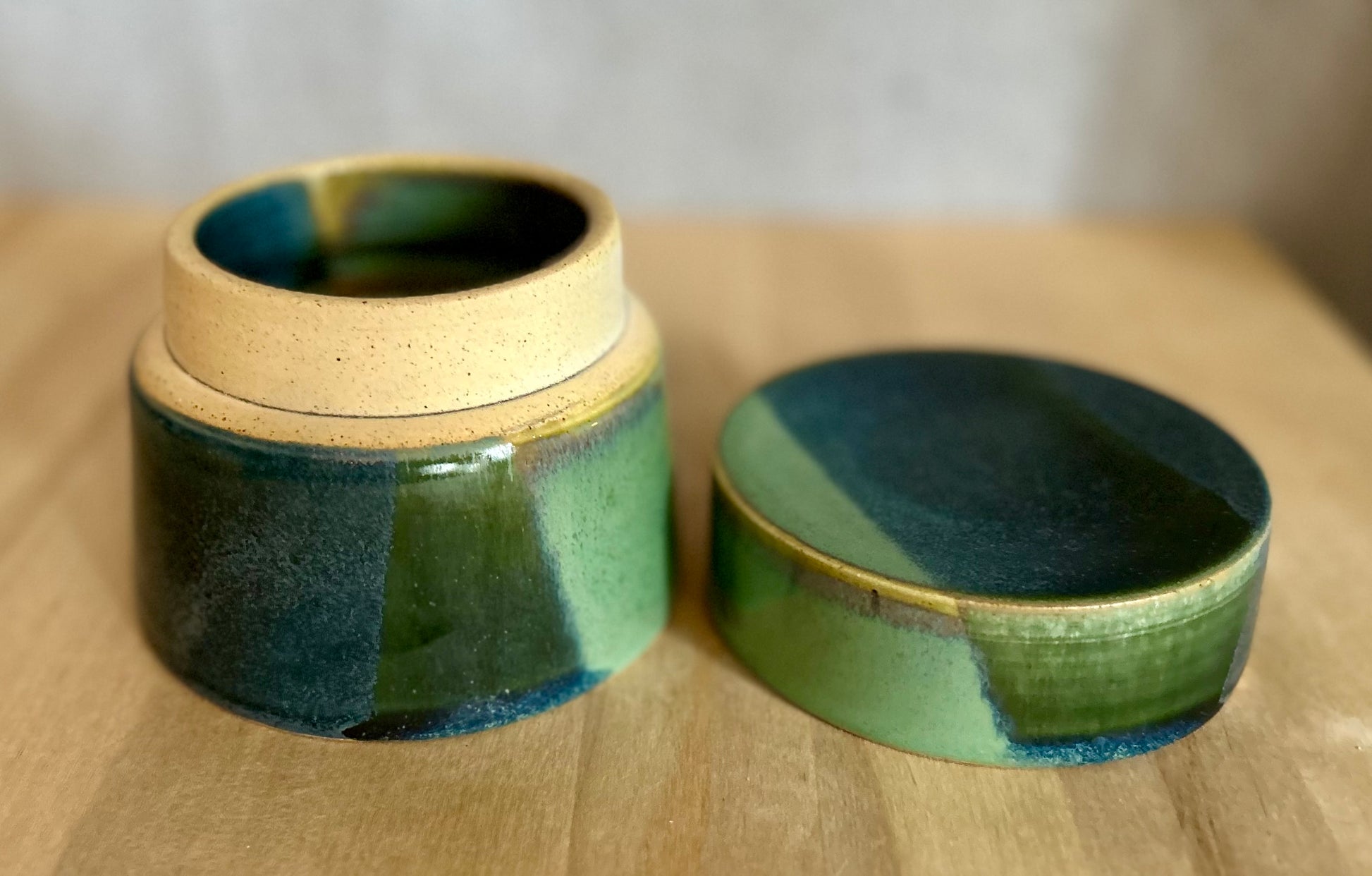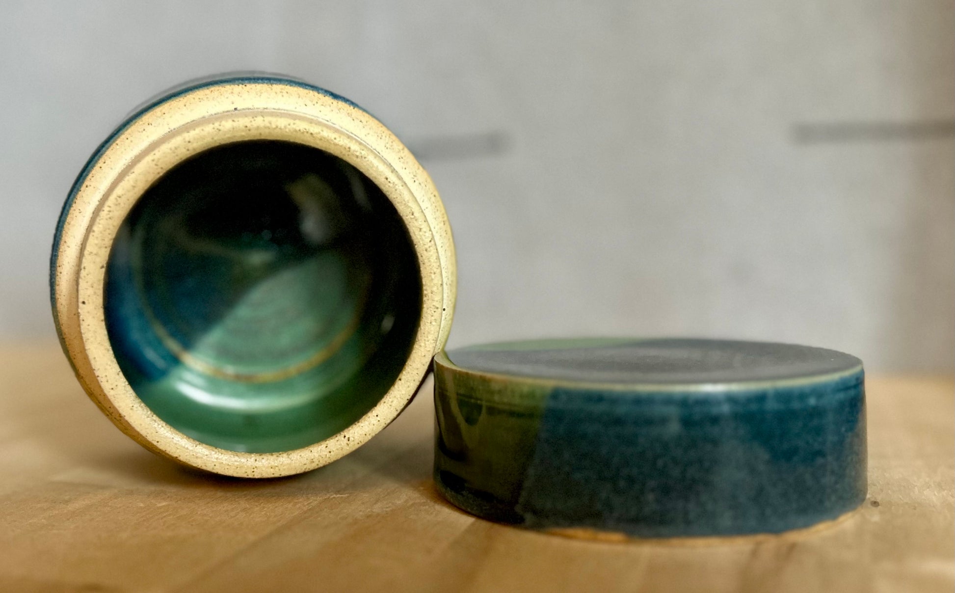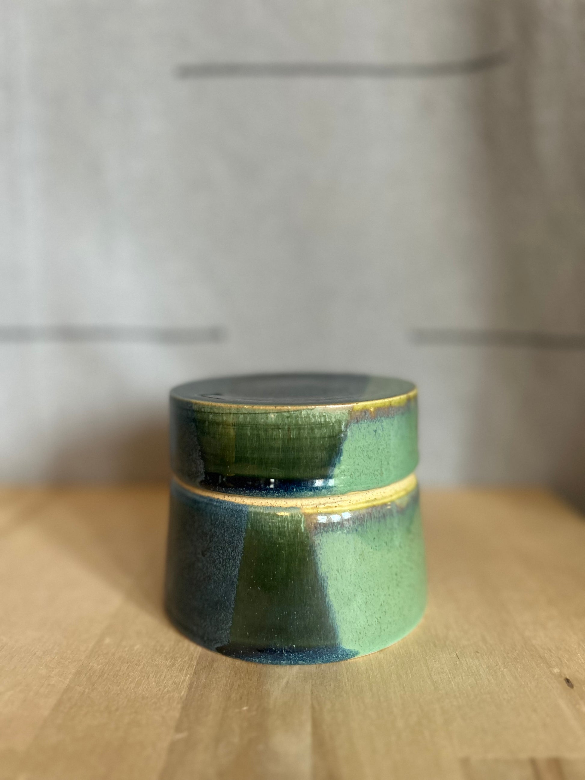 2.25”(without lid) 3.5”(with lid) tall 4” wide. Hand thrown in small batches in Door County, WI, each Garden Girl Stoneware piece is a unique, one-of-a-kind vessel. Fired to over 2200 degrees, these pots are food-safe, durable, and made for everyday use--dishwasher ready and adventure approved. From road trips and job sites to campfires and backyard farms, this stoneware is meant to be used. Earthy glazes and forms are inspired by antique utilitarian stoneware and the enduring beauty of nature.