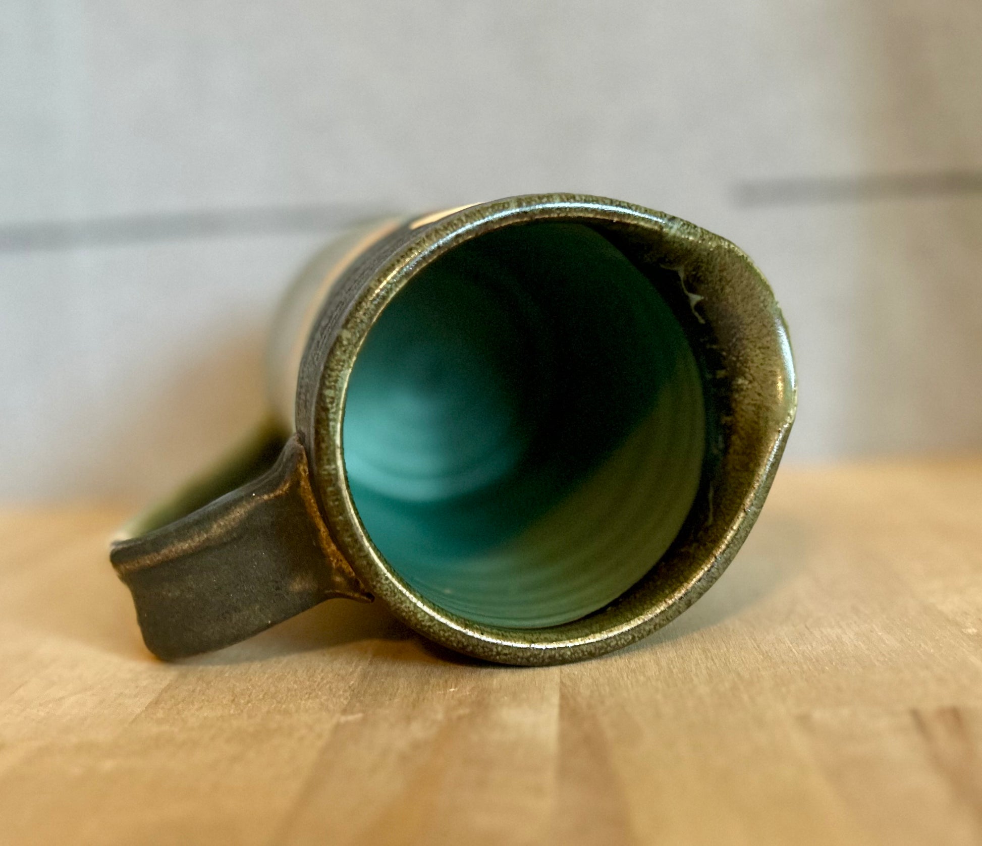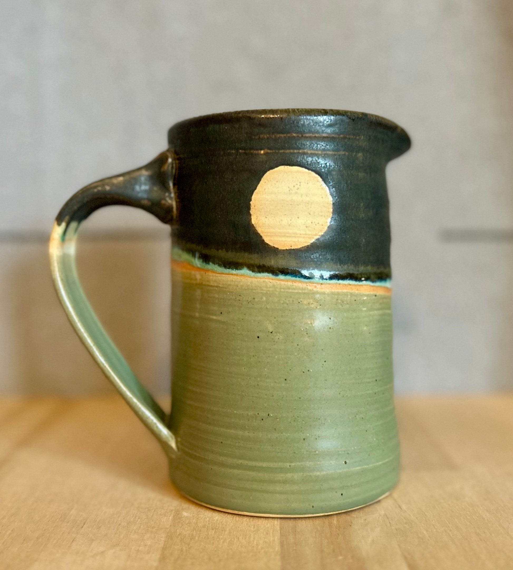24 oz pitcher. 6” tall by 6” wide. Hand thrown in small batches in Door County, WI, each Garden Girl Stoneware piece is a unique, one-of-a-kind vessel. Fired to over 2200 degrees, these pots are food-safe, durable, and made for everyday use--dishwasher ready and adventure approved. From road trips and job sites to campfires and backyard farms, this stoneware is meant to be used. Earthy glazes and forms are inspired by antique utilitarian stoneware and the enduring beauty of nature. Dishwasher safe.