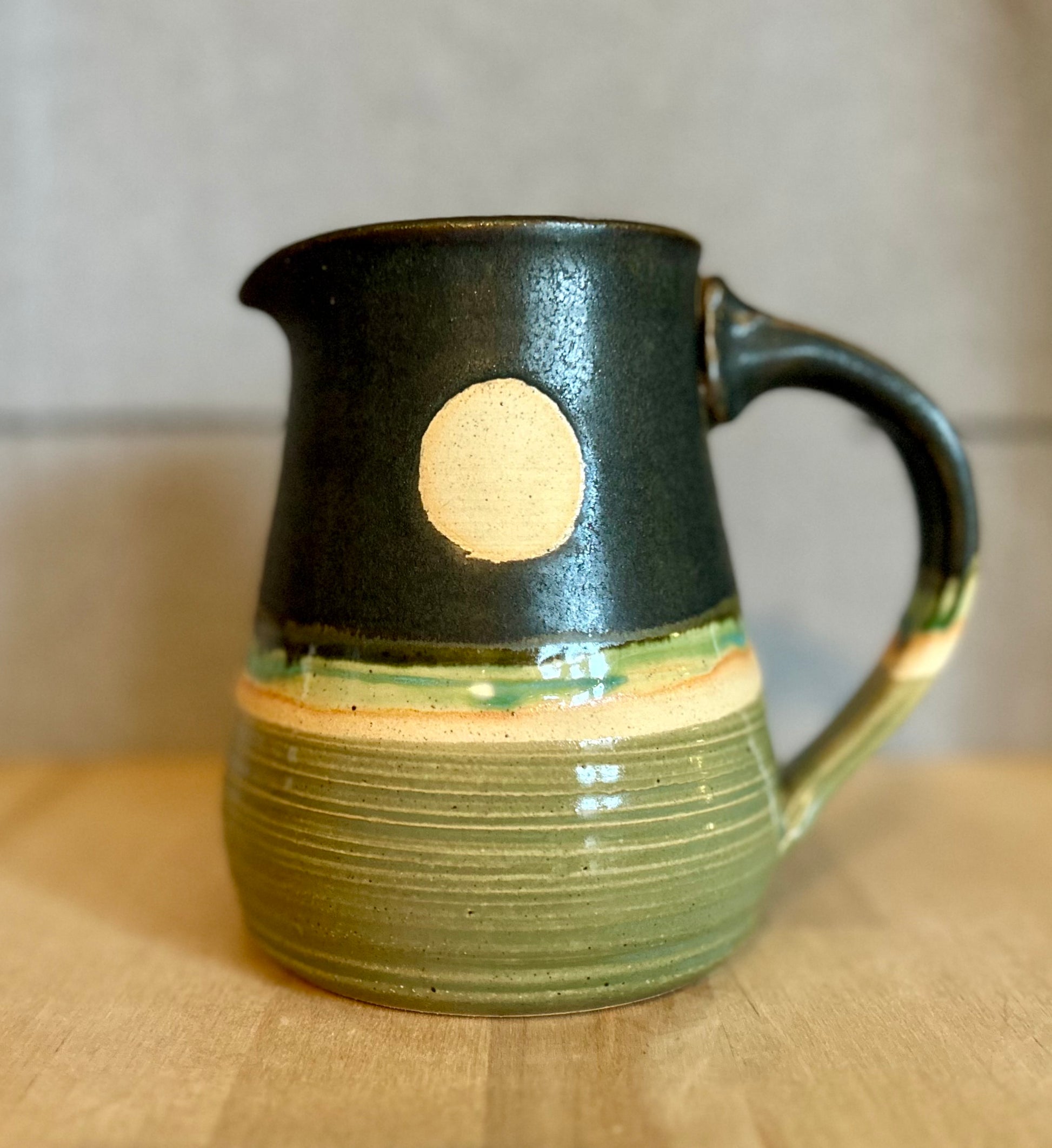 24 oz pitcher. 5.75” by 5.25” wide. Hand thrown in small batches in Door County, WI, each Garden Girl Stoneware piece is a unique, one-of-a-kind vessel. Fired to over 2200 degrees, these pots are food-safe, durable, and made for everyday use--dishwasher ready and adventure approved. From road trips and job sites to campfires and backyard farms, this stoneware is meant to be used. Earthy glazes and forms are inspired by antique utilitarian stoneware and the enduring beauty of nature. Dishwasher safe.