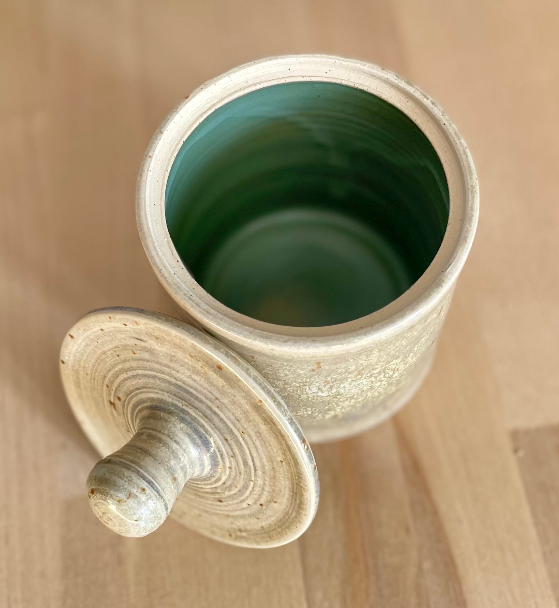4”(without lid) 6”(with lid) tall 4” wide. This jar has just a hint of lavender in the glaze. Hand thrown in small batches in Door County, WI, each Garden Girl Stoneware piece is a unique, one-of-a-kind vessel. Fired to over 2200 degrees, these pots are food-safe, durable, and made for everyday use--dishwasher ready and adventure approved. From road trips and job sites to campfires and backyard farms, this stoneware is meant to be used. Earthy glazes and forms are inspired by antique utilitarian stoneware and the enduring beauty of nature. Dishwasher safe.