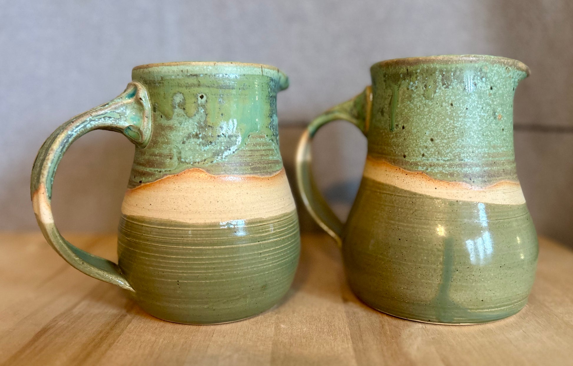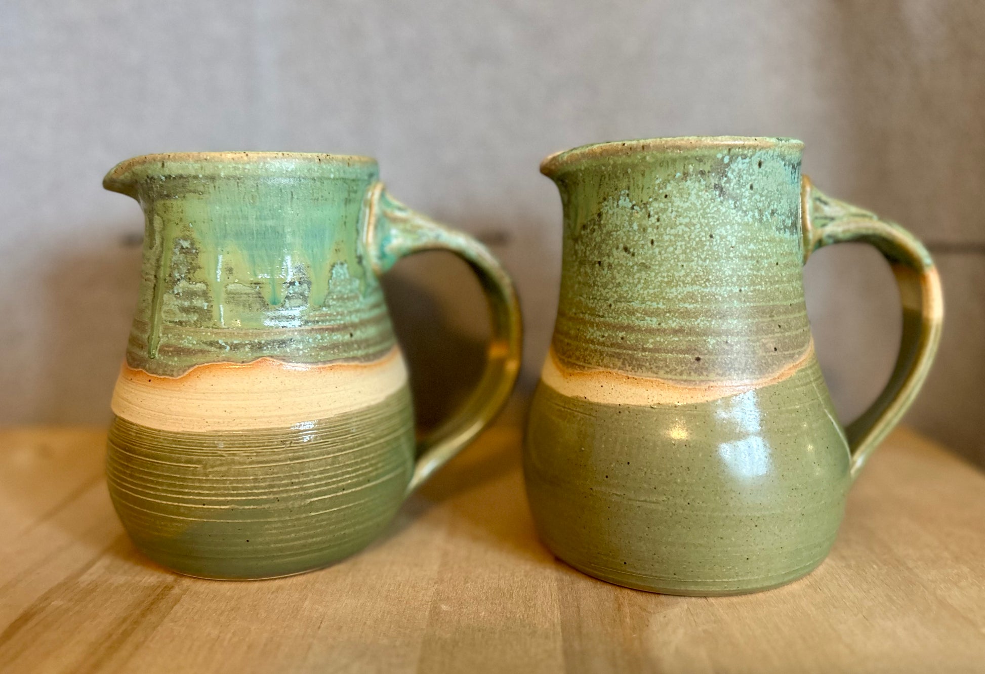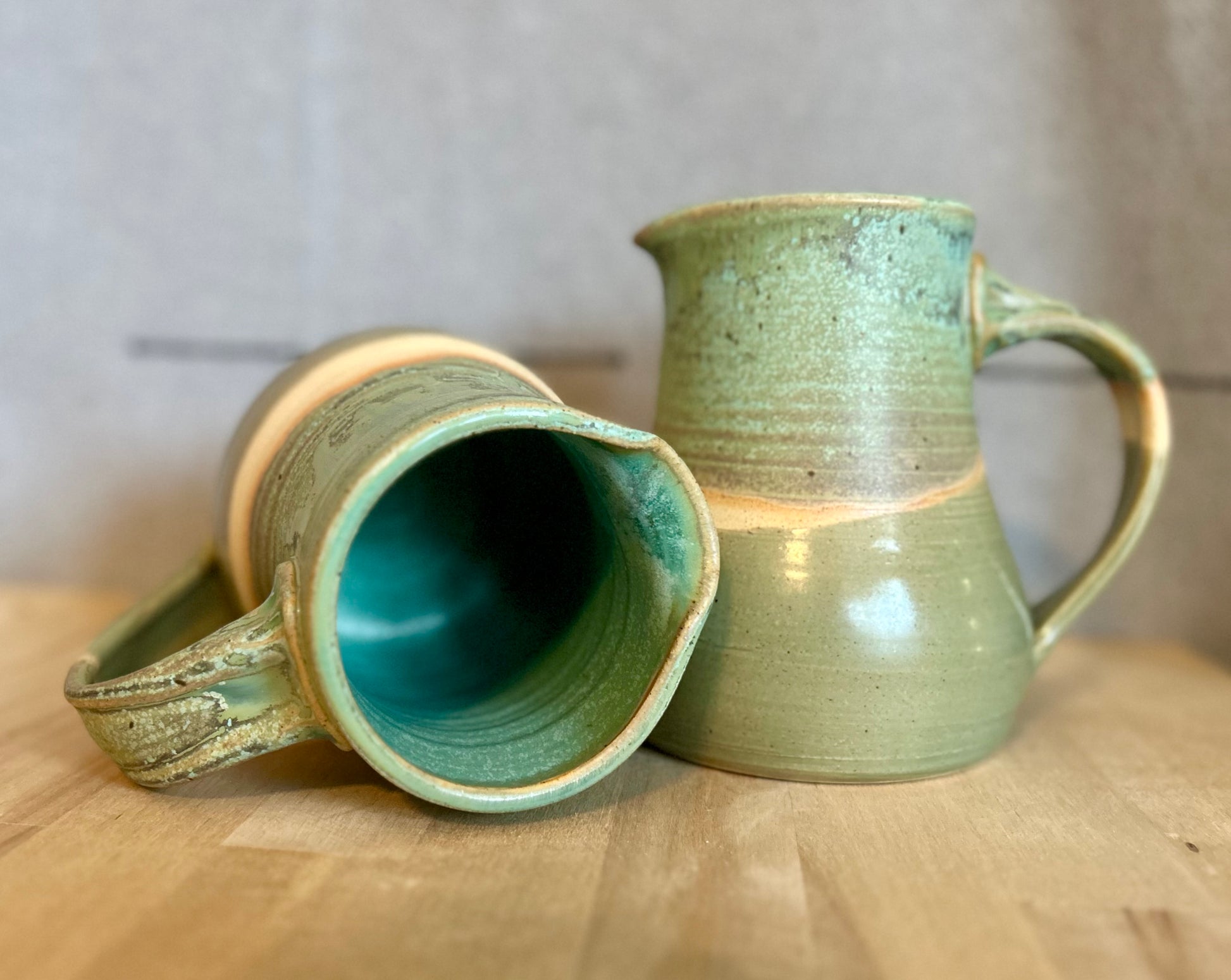 24 oz pitcher. 5.75” by 5.25” wide. Hand thrown in small batches in Door County, WI, each Garden Girl Stoneware piece is a unique, one-of-a-kind vessel. Fired to over 2200 degrees, these pots are food-safe, durable, and made for everyday use--dishwasher ready and adventure approved. From road trips and job sites to campfires and backyard farms, this stoneware is meant to be used. Earthy glazes and forms are inspired by antique utilitarian stoneware and the enduring beauty of nature. Dishwasher safe.