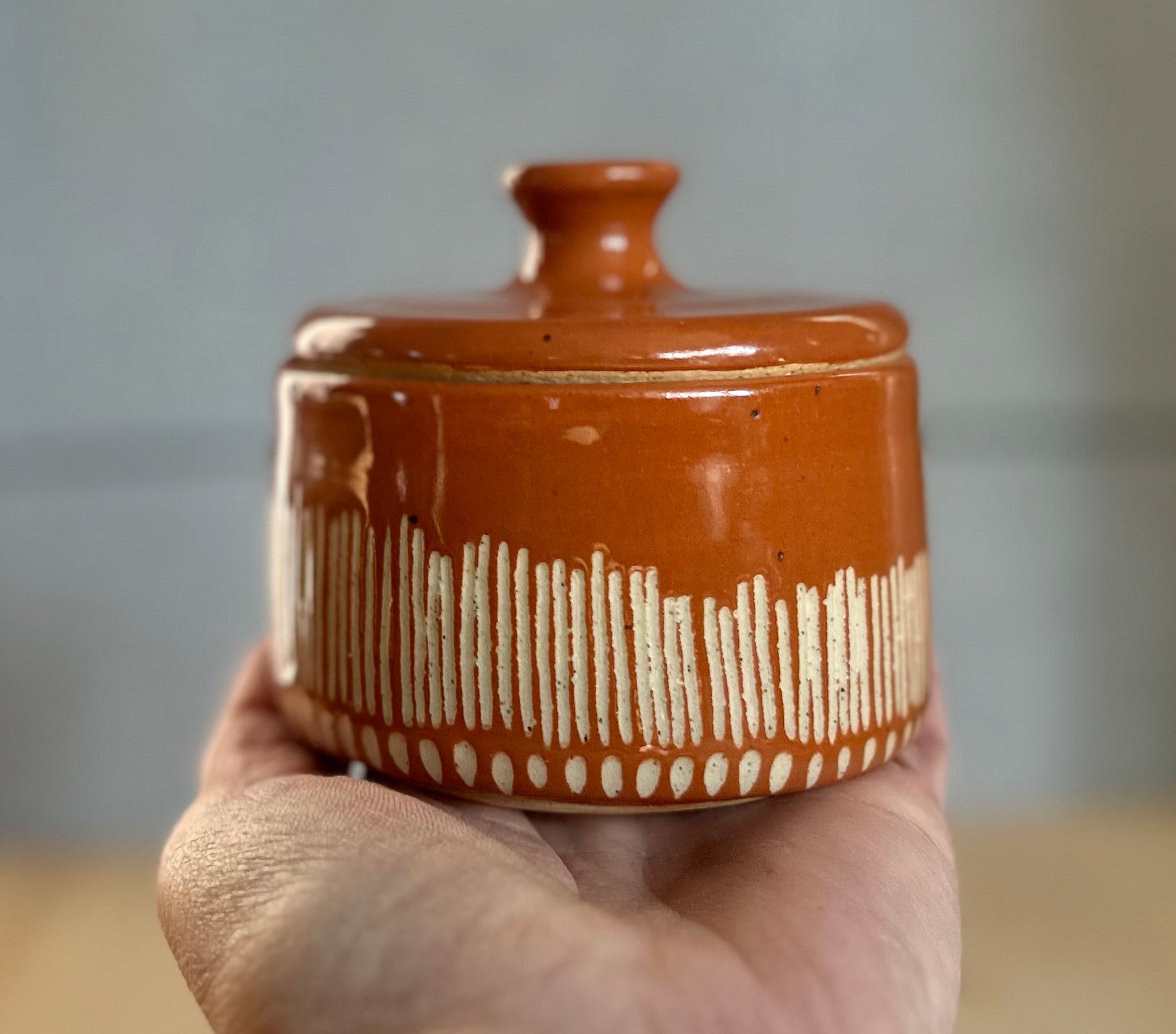 3.5” tall by 3” wide. Hand thrown in small batches in Door County, WI, each Garden Girl Stoneware piece is a unique, one-of-a-kind vessel. Fired to over 2200 degrees, these pots are food-safe, durable, and made for everyday use--dishwasher ready and adventure approved. From road trips and job sites to campfires and backyard farms, this stoneware is meant to be used. Earthy glazes and forms are inspired by antique utilitarian stoneware and the enduring beauty of nature. Dishwasher safe.