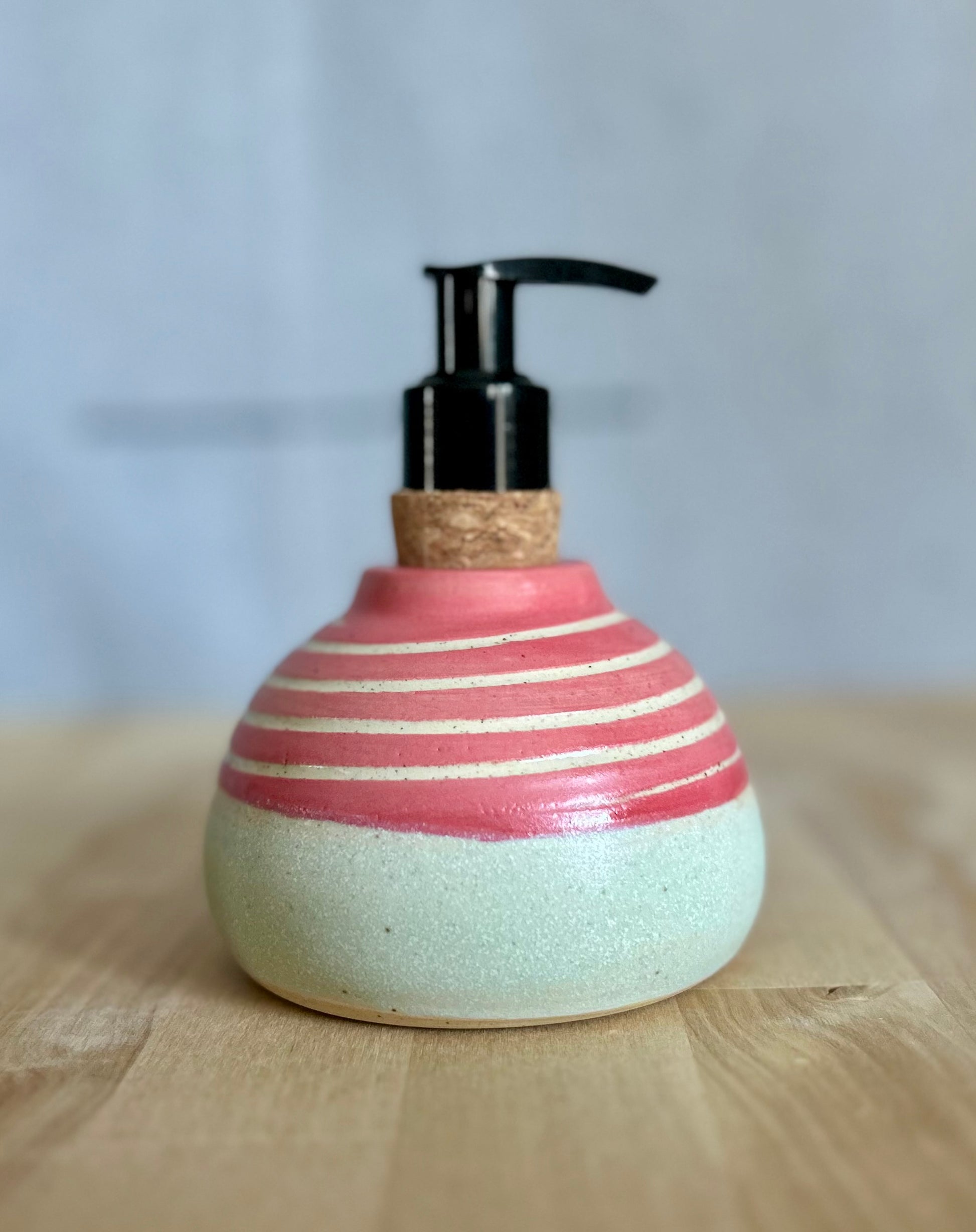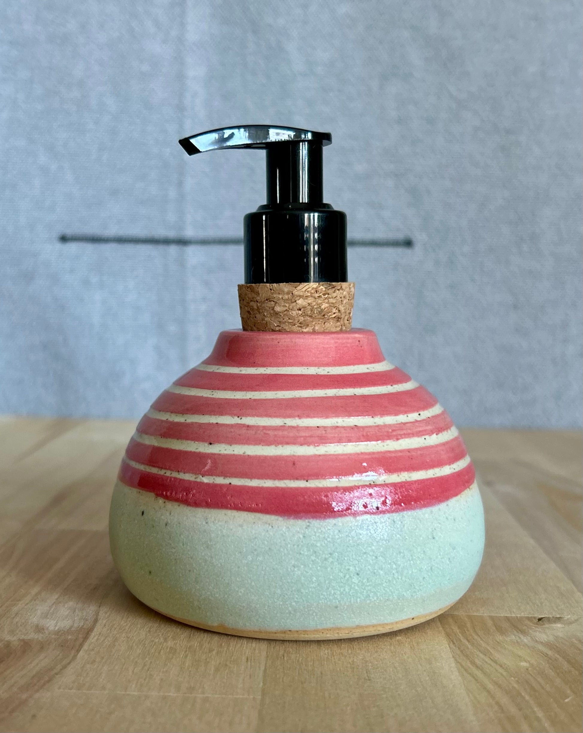 8-10 oz soap dispenser. Hand thrown in small batches in Door County, WI, each Garden Girl Stoneware piece is a unique, one-of-a-kind vessel. Fired to over 2200 degrees, these pots are food-safe, durable, and made for everyday use--dishwasher ready and adventure approved. From road trips and job sites to campfires and backyard farms, this stoneware is meant to be used. Earthy glazes and forms are inspired by antique utilitarian stoneware and the enduring beauty of nature.